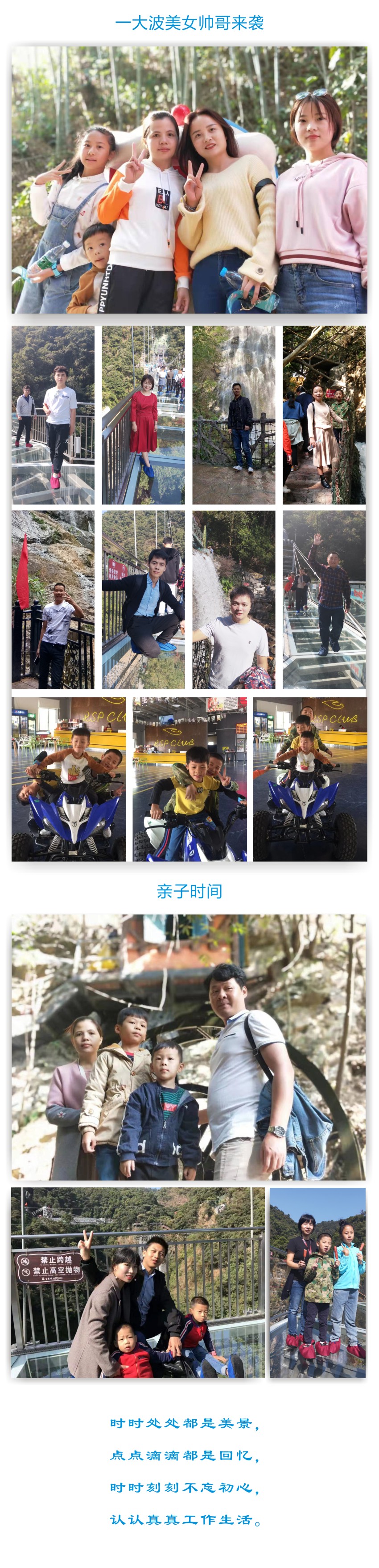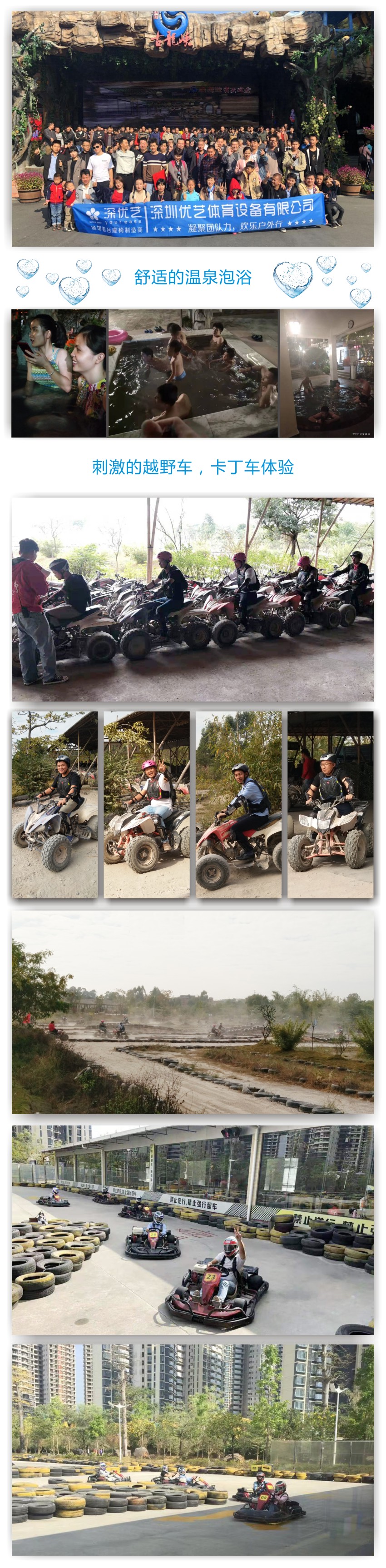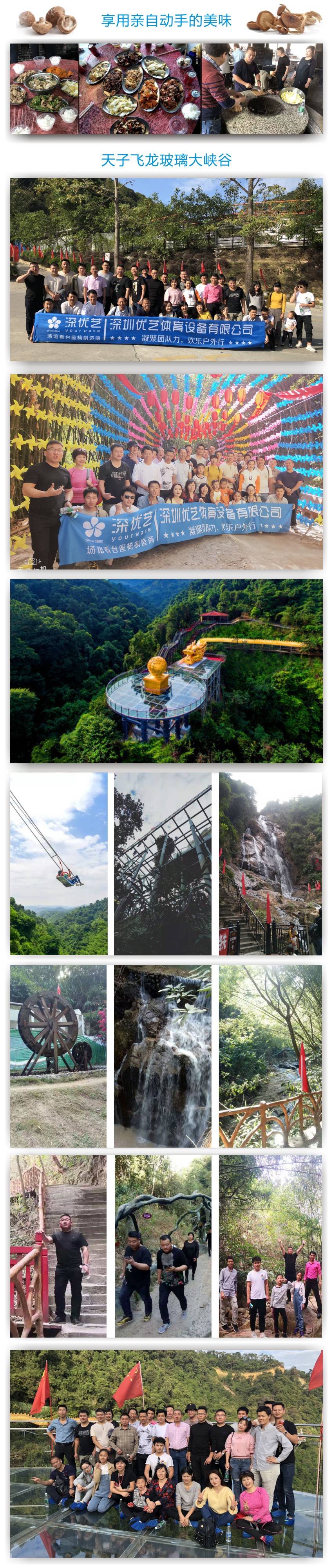 優(yōu)藝體育公司本部的部分員工開啟了清遠三天兩夜的旅程;同時我們?yōu)檫€在公司生產崗位堅守的同事,全國各地辦事處的同事,遠在外地出差的同事,在外安裝的工程部兄弟姐妹們道一聲辛苦了,正是因為大家的辛勤努力工作,我們才能安心的外出旅行,謝謝大家。