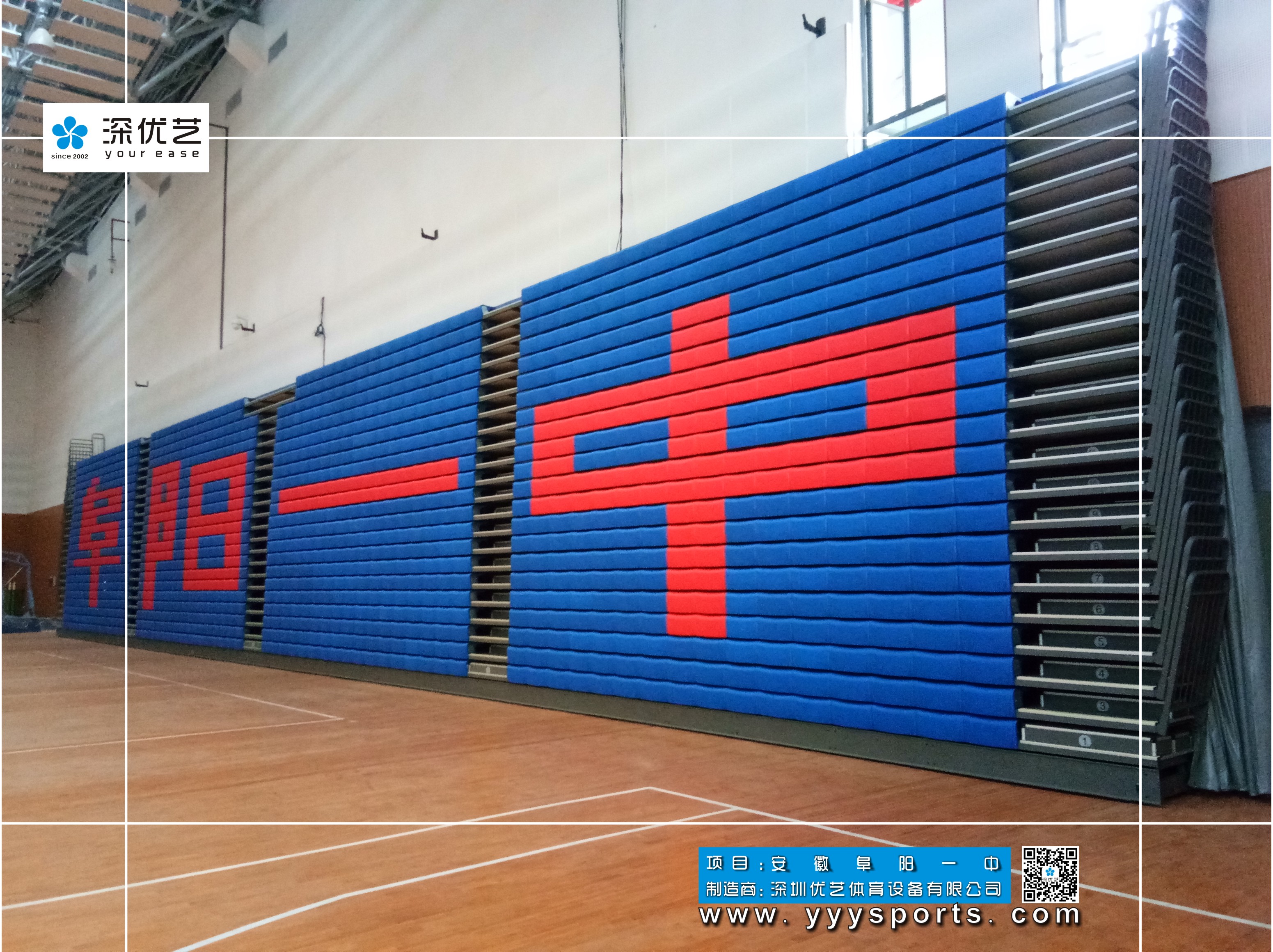 阜陽一中新校區(qū)體育館為滿足室內體育教學、訓練、學校晚會表演活動等場地需要。選擇藍色座椅+紅色座椅的搭配,紅色的炙熱結合藍色的夢想,傳遞純碎的興奮、能量與激情,“阜陽一中”四個紅色大字標致設計,體現(xiàn)了阜陽一中的磅礴氣勢。